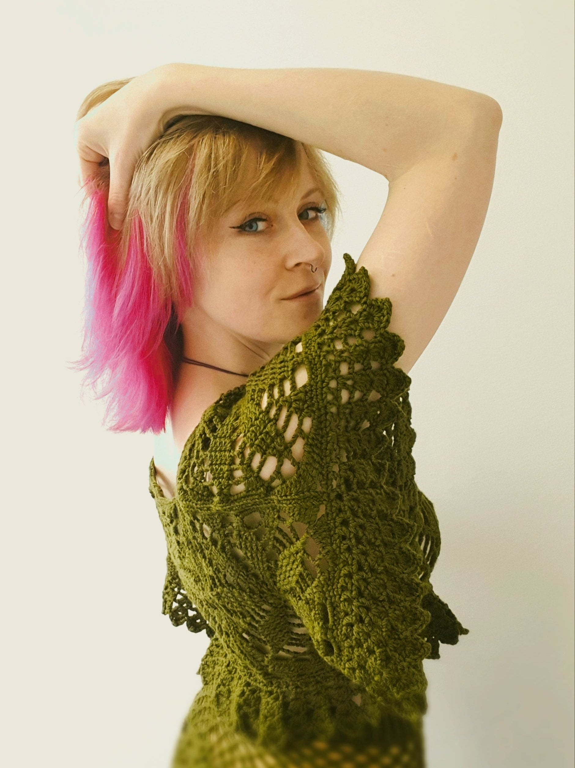 Because I usually design gauge-less, I instead make my patterns work to be as unique as you. Working in as many made-to-measure components into my wearables as possible is the simplest way make them truly inclusive. I generally try to focus on designs which work on all body shapes & sizes, no matter how much they are sized down or up.