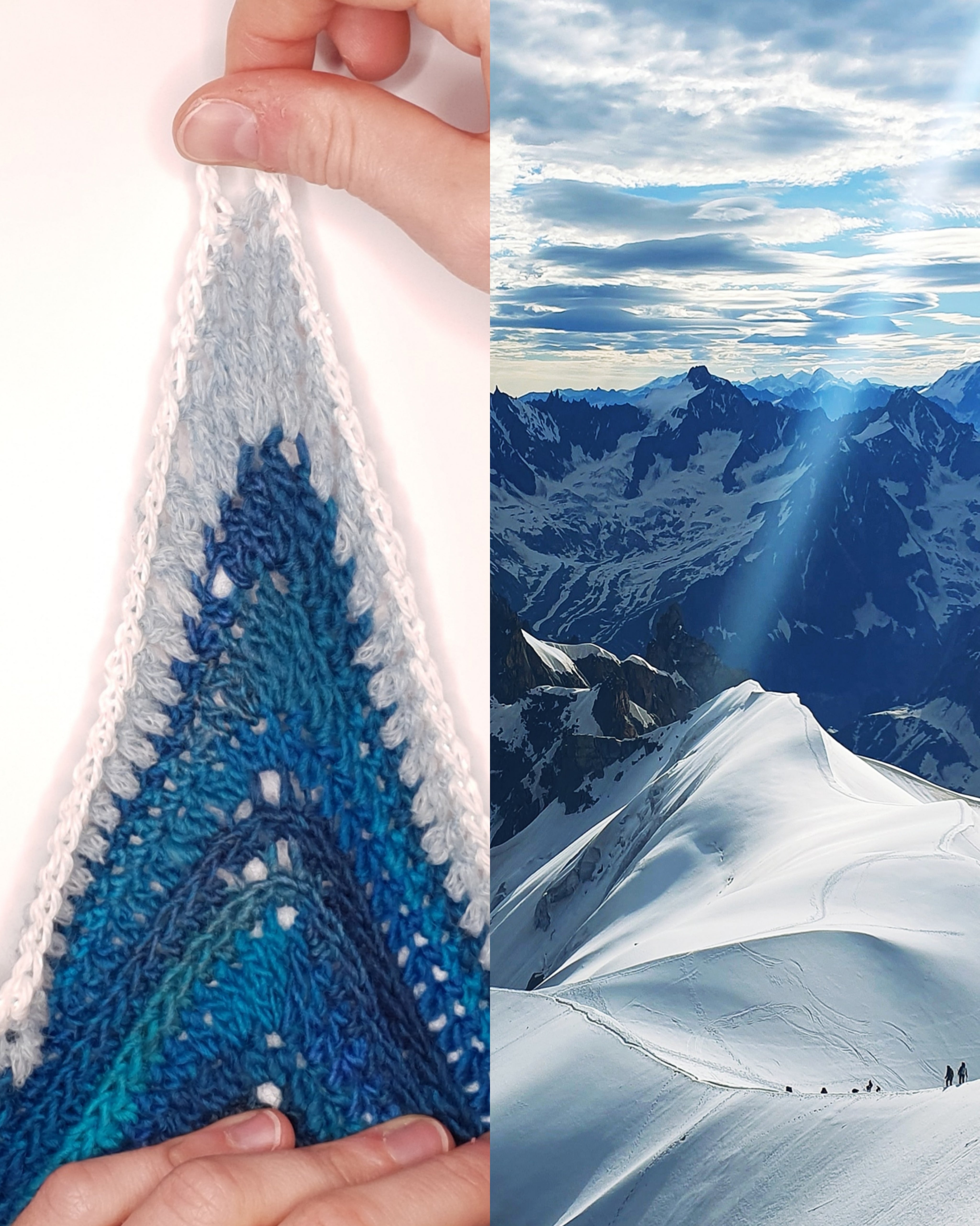 How do you maintain creative integrity when the need to eat and sleep securely demands that you commodify your creative process? Somewhere between mountain top and descent back down into the valley, the idea for a dress occurs. It is a small, inconsequential dawning of an idea- as unremarkable as the regular rising of the sun over the Aiguille du Midi each morning for the last three million years or so. Months pass and a love of the mountains, their disappearing glaciers and the wool sheered from their foothills is worked into thousands of stitched, only to be frogged and reworked again. And again.